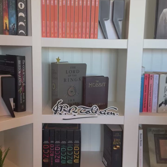 Bring a touch of timeless fantasy to your bookshelf with this elegant signature display. Crafted in bold, calligraphic style, this piece is designed as a striking accent for collectors of epic literature and lovers of classic tales.